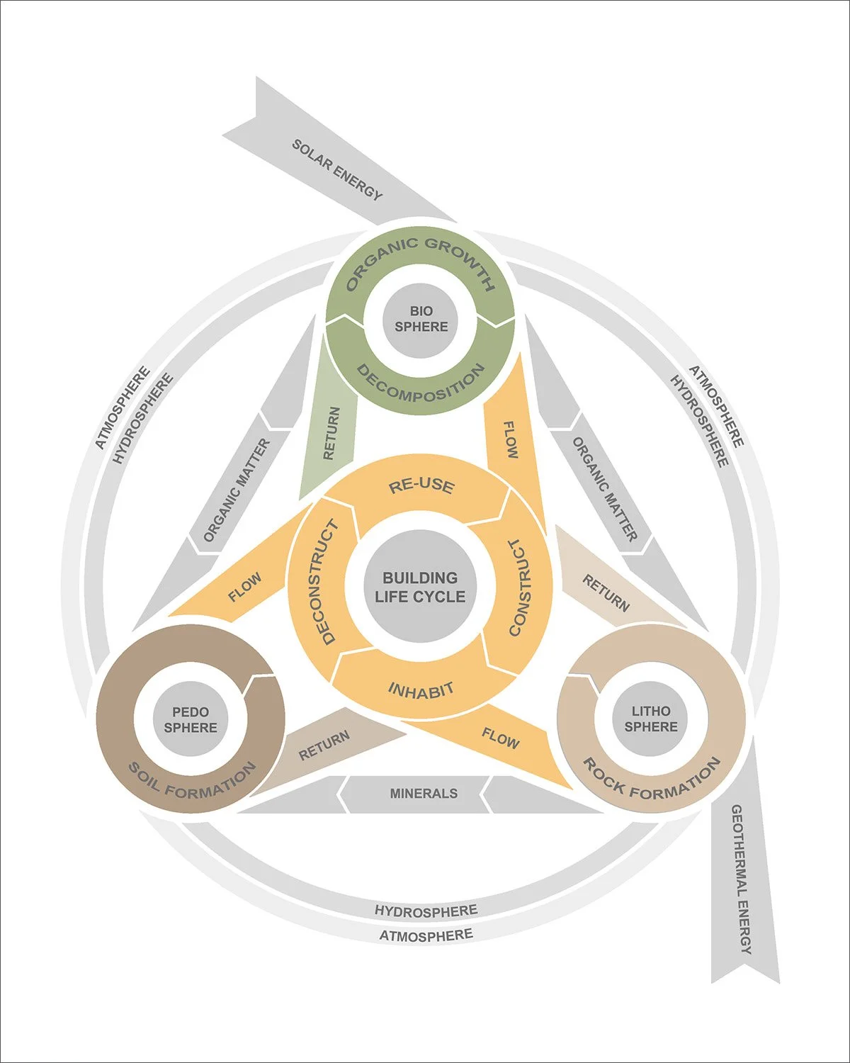 We developed this diagram to articulate the relationship between the building life cycle at the centre and key geochemical spheres - biosphere, pedosphere (soil and mud), and lithosphere (stone and minerals). The diagram focusses on these three spheres when talking about building materials because they relate more directly to components that are able travel into and out of the building life cycle and can be re-used – a process of exchange which is represented by the paths of flow and return.